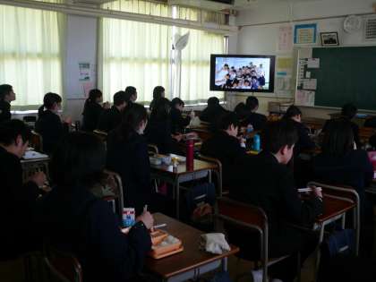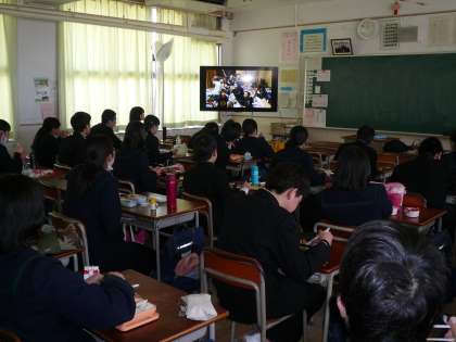 3年1組ではお昼を食べながら、この1年間に行事などで撮りためた写真を見ました。