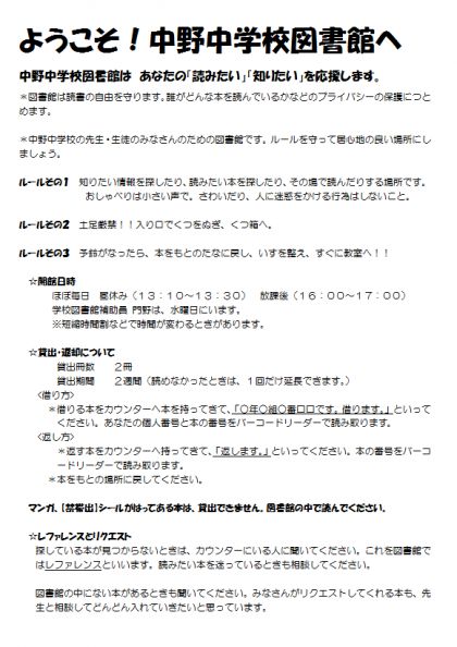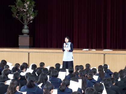 本日、1年生の学年集会において、学校図書館補助員さんより、図書館利用のお話がありました。来週から図書館もオープンします。生徒の皆さんどんどん利用してね。