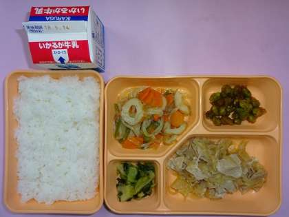今日の給食では、ちくわと野菜の炒めものの味つけに加えています。