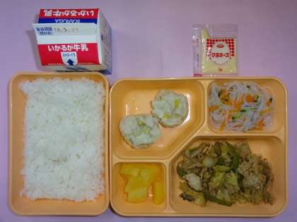 今日の給食では、キャベツ、キュウリ、ニンジンを合わせてサラダとして使用しています。食品衛生上、マヨネーズはあえていませんので、各自でマヨネーズをかけて食べるようにしています。