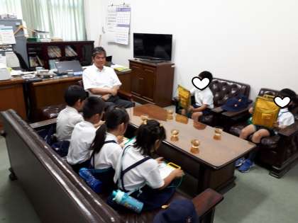5月22日(火)1000、南百済小学校の2年生6人が、中野中学校に生活科の学習の一環として「町たんけん」に来られました.