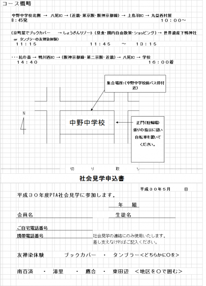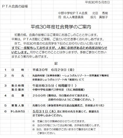 PTA社会見学の案内を本日再度お配りしています。