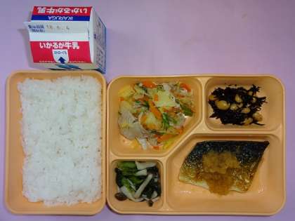 今日の給食では、大根おろしと混ぜ合わせて、焼いた鯖にかけています。