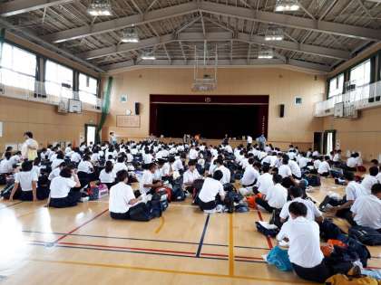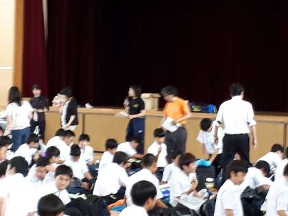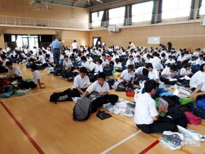 3年生は体育館にて、忘れ物チェック、荷つくり直しをしています。