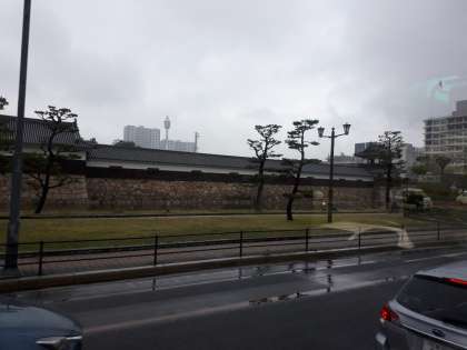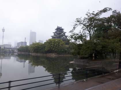 バスガイドさんに、広島城のお話を聞いています。