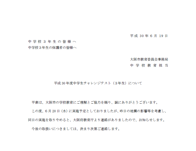 市教委から連絡があり、明日の3年生のチャレンジテストは取止めとなりました。今後のチャレンジテストの取り扱いについては、連絡が来次第お伝えいたします。