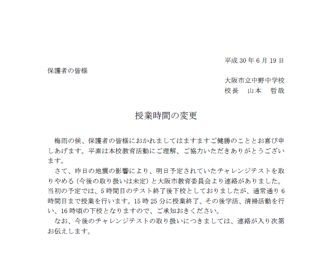 それに伴い、学校では、3年生明日は5時間目までの予定でしたが、通常通り6時間目まで授業を行います。よろしくご査収ください。