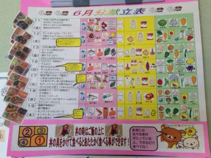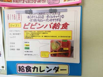 北館を入ると多目的室とトイレの間の壁に掛かっている「給食カレンダー」を保護者のみなさま、ご存じですか?クイズもあり、とても勉強になります。本校の栄養技師の高木先生が作成しております。ぜひ、学校へお越しの際は、ご覧ください。