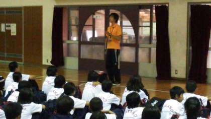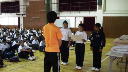 大阪府立少年自然の家に到着して職員の方から施設の注意事項のお話がありました。そのあと、1年生代表者によるあいさつを行いました。職員のみなさま、2日間よろしくお願いします。!