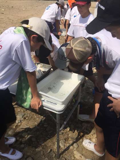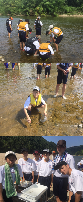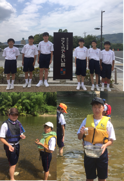 午前中はさくらであい館で、琵琶湖から流れる川の説明や水質調査の意味や生物の学習をして、午後からは木津川に向かい気温・水温や水流の速さ水の汚れを調査し、水質生物の採取後、1枚のレポートにまとめました。