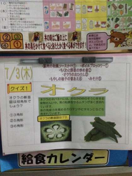 です。7月3日(木)の給食カレンダーは「オクラ」をテーマに取り上げています。みんなぜひ、給食カレンダーを見てください。