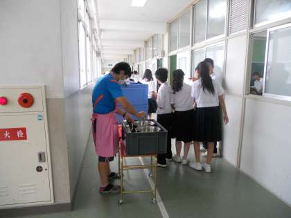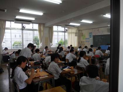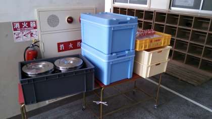 7月3日(木)、今日の給食にみそ汁が食缶で運ばれました。写真は1年生の教職員が子どもたちにみそ汁を容器に注いでいる様子です。