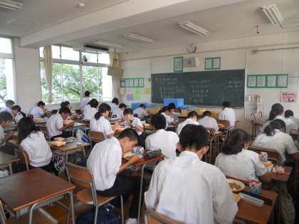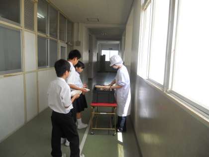 7月8日(火)の給食は夏野菜カレーライスでした。先生方にカレーを盛り付けてもらって、おいしくいただきました。