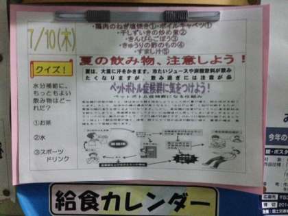 です。1学期最後の給食クイズです。「水分補給にもっともよい飲み物は何でしょうか?」考えてください。