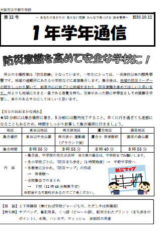 明日の土曜授業・防災訓練は、1年生は、スタートが地域の避難所に当たる学校や校園です。そこから、安全なところ、危険なところを学校まで歩いていき、「防災マップ」を作成する運びになっています。保護者の皆様も、ぜひ、集合場所にお越しいただき、生徒とともに、地域を歩いてみませんか?お待ちしています。