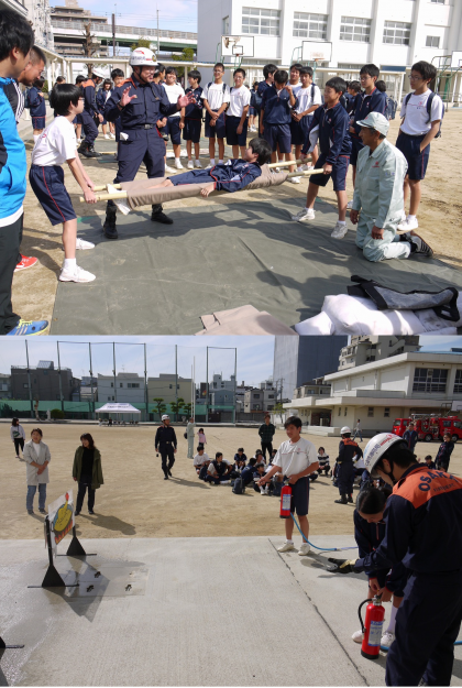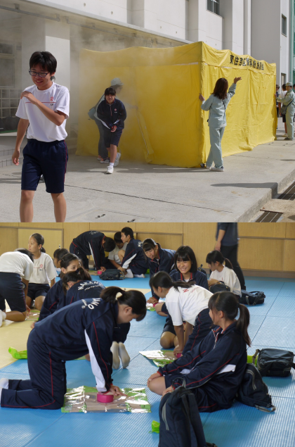 2年生の2時間目は、消防署の指示による、防災体験です。煙の中体験、救命体験、負傷者救出体験、消火体験を、順次経験しました。
