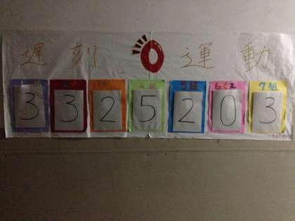 遅刻0運動最終日、上の写真の結果の通り1年生全クラスが遅刻0を達成することはできませんでした。しかし、時間を大切にすることは子どもたちに常に言い続けていきます。