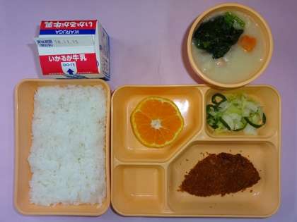 今日の給食では、鶏肉、ベーコン、じゃがいも、大根、玉ねぎ、にんじん、ブナシメジを具材にしたクリームシチューにしています。ほうれん草は一緒に煮込んでしまうと給食として食べるころには、色が変わってしまうため、おかず容器に盛りつけており、各自でシチューの中に入れて食べてもらうようにしています。