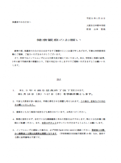 本日、3年6組が昼食後下校、明日、明後日を学級休業とします。