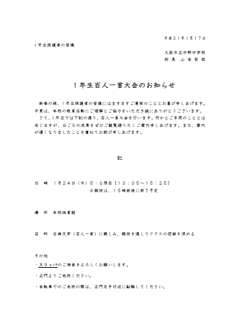 来たる1月24日(木)5.6時間目(13時35分)より体育館にて 1年生は、百人一首大会を行います。