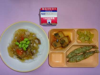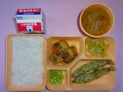 今日の給食では、カペリンに青のり風味の衣が付いた製品を使っています。