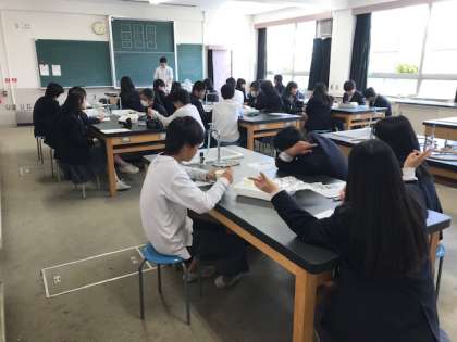 本日は2年生の6限の授業見学をしました。2年1組は理科室で班ごとで実験を行っています。2年2組は、教室で社会の授業が行われています。中堅の学年です、しっかり授業に取り組みましょう。