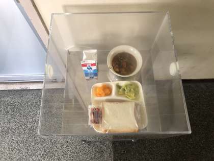 パン、牛乳、ビーフシチュー、キャベツのピクルス、ミカンの缶詰、イチゴジャムでした。