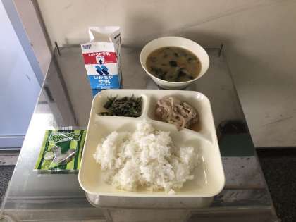 ごはん、牛乳、豚肉のおろしじょうゆかけ、みそ汁、じゃこピーマン、まっ茶大豆