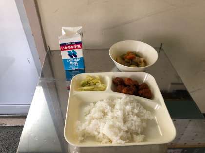 ごはん、牛乳、まぐろのオーロラ煮、じゃがいもと野菜の含め煮、キャベツの梅風味