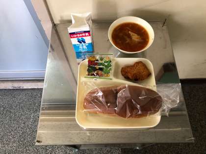 今日の給食は パン、牛乳、一口トンカツ、ミネストローネ、豆こんぶ です。いただきます!!