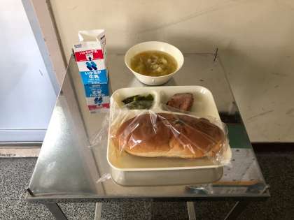 パン、牛乳、かつおのガーリック焼き、鶏肉とじゃがいものスープ、グリーンアスパラガスののサラダです。