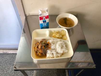 5月13日(月)本日の給食は 牛乳、豚丼(ごはん)、湯葉のすまし汁、焼きじゃが です。いただきます!!