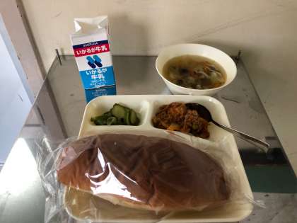 パン、牛乳、じゃがいものミートグラタン、スープ、キュウリのピクルスです!