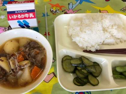 ごはん、牛乳、肉じゃが、きゅうりのかつお梅風味 枝豆 です。
