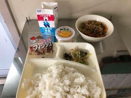 ごはん、牛乳、マーボーはるさめ、チンゲンサイともやしの甘酢あえ、アーモンドフィッシュ、ミカンゼリーです。