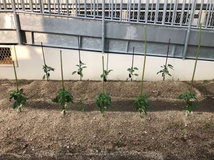 水泳部がプールで練習している傍らプール横の畑ではナスが実をつけています。