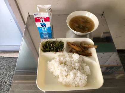 ごはん、牛乳、いわしのてんぷら、すまし汁、豚肉とさんどまめのいためものです。