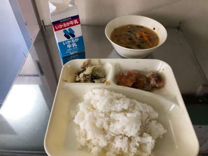 6/13今日の給食は ごはん、牛乳、鶏肉のおろしじょうゆかけ、みそ汁、野菜炒めです! いただきます!!