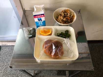 今日の給食は パン、牛乳、焼きそば、オクラのかつお梅風味、オレンジです。 いただきます!