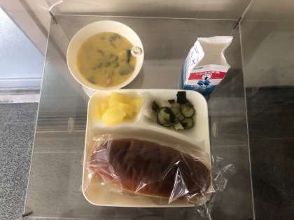 6/21(金)今日の給食はパン、牛乳、かぼちゃのクリームシチュー、ミックス海藻のサラダ、りんご(カット缶)です。いただきます!!