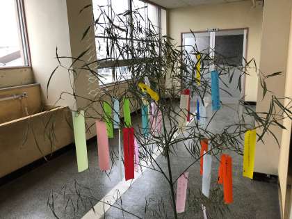 1年生のフロアに行くと短冊に願い事が書かれた笹がありました。
