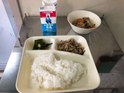 今日の給食はごはん、牛乳、豚肉とじゃがいもの煮物、オクラの甘酢あえ、ツナッ葉いためです。いただきます!
