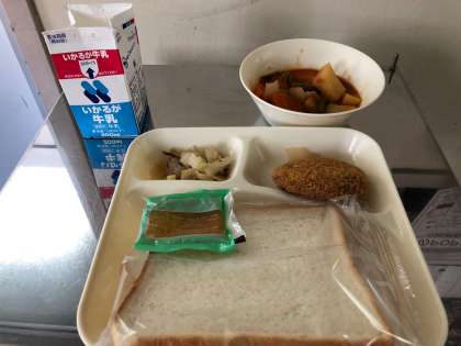 7/17(水)今日の給食はパン、牛乳、チキンレバーカツ、ケチャップ煮、たことキャベツのソテー、リンゴジャムです。