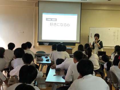 養護教諭の村上tより事前に2年生にとったアンケートを踏まえ、「好きになるこころ」という内容で実践を行いました。