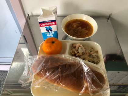 今日の給食はパン、牛乳、豆乳マカロニグラタン、トマトスープ、冷みかんでした。 ごちそうさまでした。