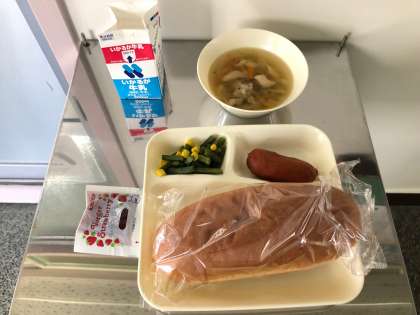 今日の給食はパン、牛乳、フランクフルト、スープ、さんどまめとコーンのサラダ、イチゴジャムです。ごちそうさまでした!!