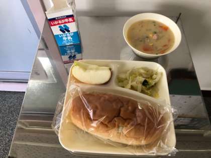 今日の給食はパン、牛乳、コーンクリームシチュー、はくさいのピクルス、りんごです。 いただきます!!