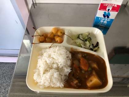 今日の給食は牛乳、ハヤシライス、キャベツのひじきドレッシング、さくらんぼです。いただきます!