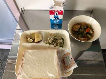 今日の給食は食パン、牛乳、豚肉といかの中華煮、やきさつまいもの甘みつかけ、もやしとピーマンのいためもの、アプリコットジャムです。ごちそうさまでした。