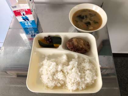 今日の給食はごはん、牛乳、和風おろしハンバーグ、みそ汁、かぼちゃのいとこ煮です。 ごちそうさまでした。